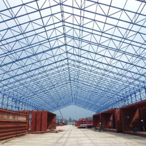 – Nhà nhịp lớn: là những loại nhà do yêu cầu sử dụng phải có nhịp khá lớn từ 30 – 40m như nhà biểu diễn, nhà thi đấu thể dục thể thao, nhà triển lãm, nhà chứa máy bay…dùng kết cấu thép là hợp lý nhất. Có những trường hợp nhịp đặc biệt lớn trên 100m thì kết cấu thép là duy nhất áp dụng được.